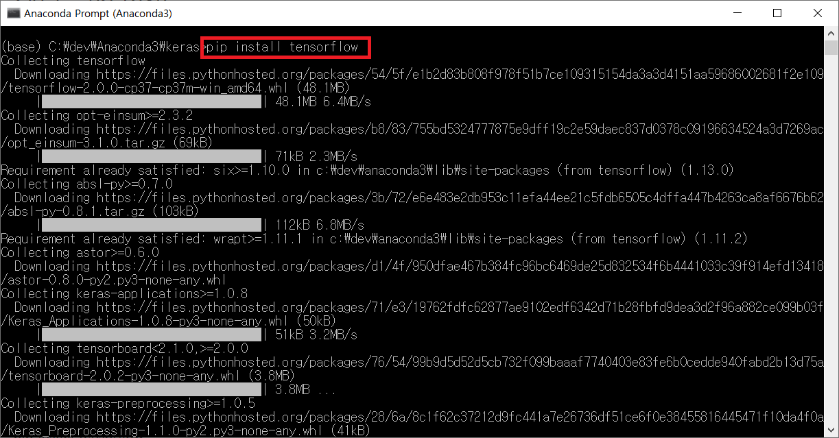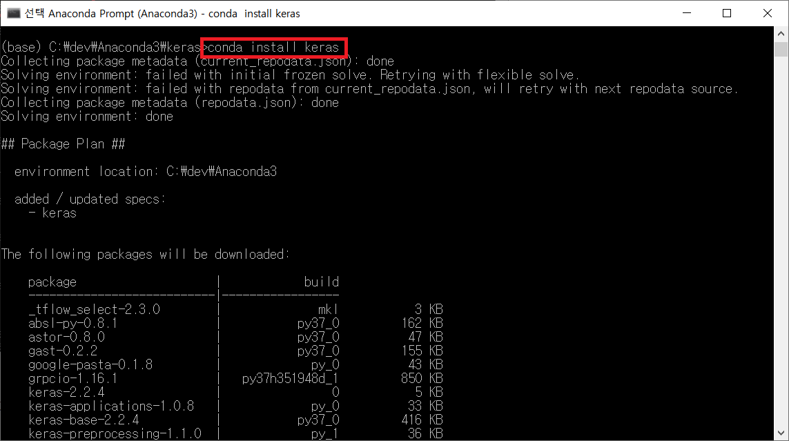 이번에는 케라스 라이브러리도 아래 명령어로 설치한다.
