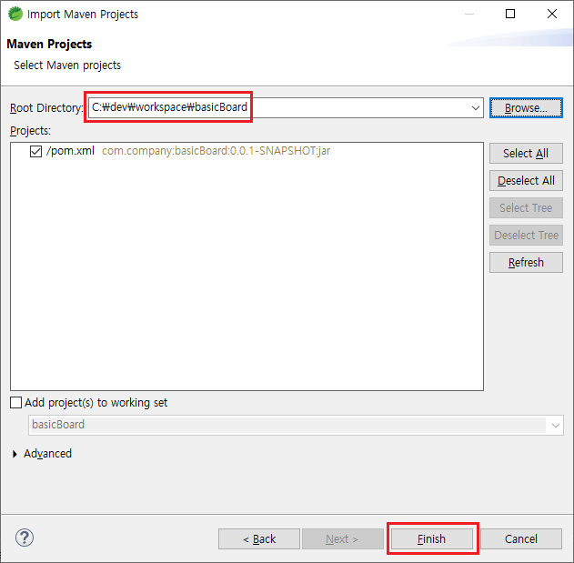 [Browse]를 클릭하여 Root Directory를 스프링부트 프로젝트 위치로 설정한다. maven 프로젝트이기 때문에 아래처럼 pom.xml 파일이 목록에 보이는지 확인하고 [Finish] 버튼을 클릭한다.