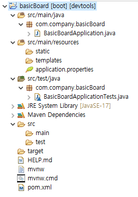 - Package name : 프로젝트에 생성할 패키지를 설정한다. (예를 들어 com.company.basicBoard)