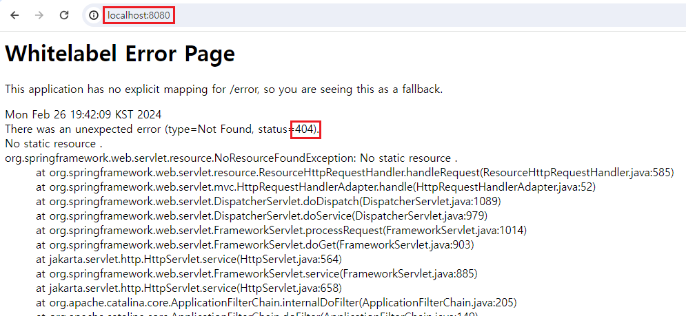 http://localhost:8080/ 로 접속하면 아래처럼 Whitelabel Error Page (404) 오류가 발생한다. 만들어진 화면이 없어서 당연히 오류가 발생한다. 타임리프 화면을 만들어보자.