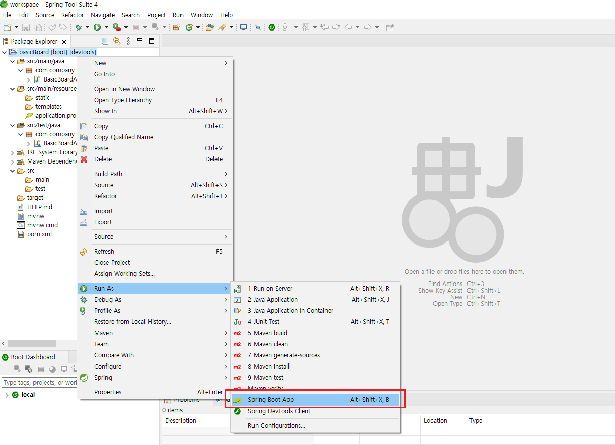 스프링부트는 Apache Tomcat을 기본 내장 컨테이너로 사용한다. 내장 톰캣이 있어서 별도로 서버를 설치하지 않아도 된다. 프로젝트 우클릭 후 [Run As] > [Spring Boot App]를 눌러 톰캣을 실행한다.