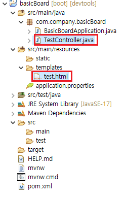 src/main/resources 패키지의 templates 폴더에서 test.html 파일을 생성한다.