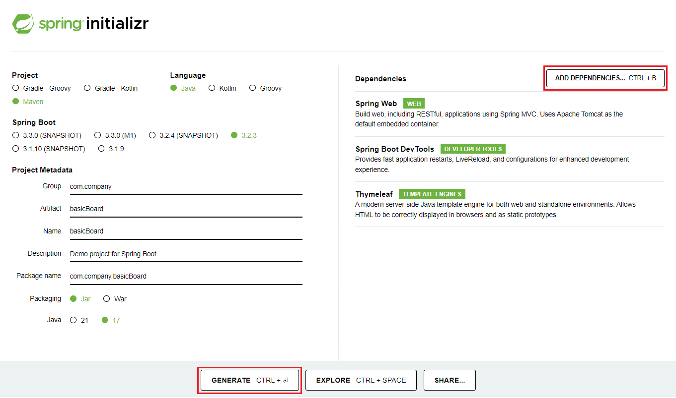 - [ADD DEPENDENCIES] 버튼을 클릭해서 필요한 의존성들을 추가한다. 나중에도 추가할 수 있으니 기본적인 것들만 선택했다. 나는 Spring Web, Spring Boot DevTools, Thymeleaf를 선택했다. 의존성 선택시 주의할 점은 DB 관련 의존성은 넣지 말자. 미리 추가해 버리면 프로젝트 생성 시 datasource 오류가 발생한다.