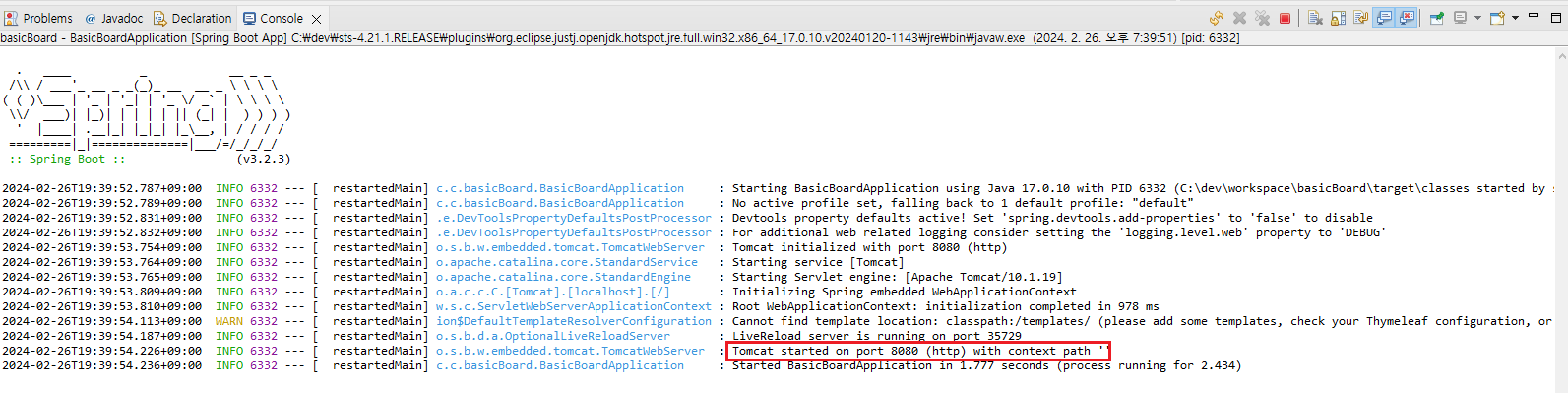콘솔창에서 톰캣이 8080 포트로 시작되었음을 알 수 있다.