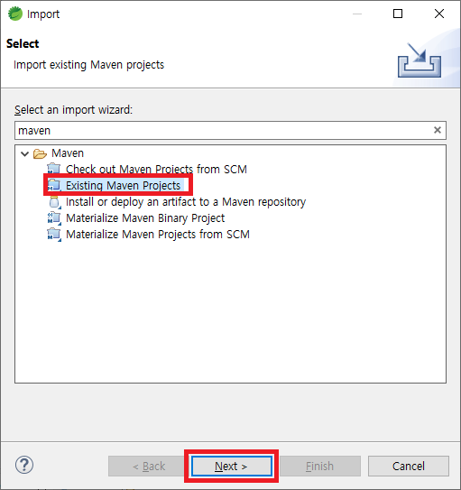 이제 STS에서 새로 만든 프로젝트를 import 하자. STS 메뉴에서 [File] > [Import]를 클릭한다. 입력란에 maven으로 검색해서 Existing Maven Project를 선택한다. (gradle일 경우 Existing Gradle Project로 검색하면 된다)