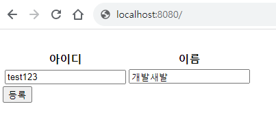 위 소스를 실행하면 아래처럼 보여진다. 아이디와 이름을 입력하고 등록 버튼 클릭 시, POST 방식으로 json 문자열 데이터를 HTTP 요청으로 보내면 @RequestBody 어노테이션을 통해 객체 데이터를 매개변수로 전달받게끔 구현하고자 한다.