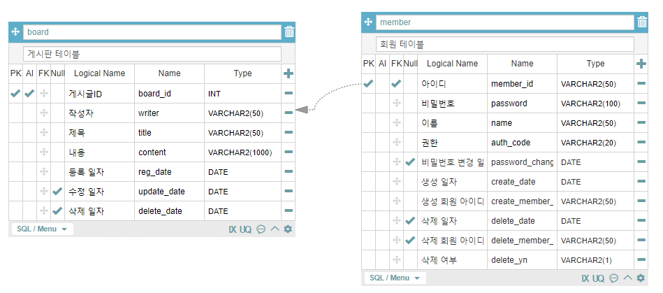 https://aquerytool.com/에서 ERD를 그린 후 모든테이블 생성 SQL을 생성해주는 기능이 있으므로 간단하게 스키마 구성을 할 수 있다.