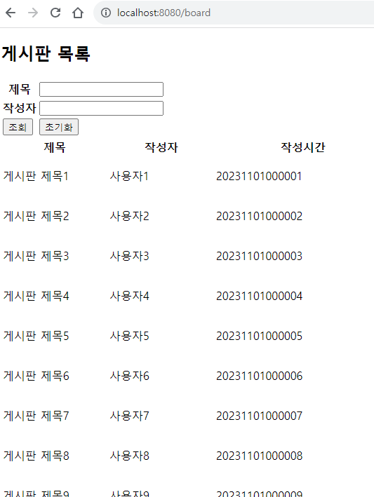 이제 최종적으로 아래 모습처럼 조회조건 (제목, 작성자)을 추가해보려고 한다. (앞으로 소스 추가되는 부분은 ✅로 별도 표시하려고 한다)