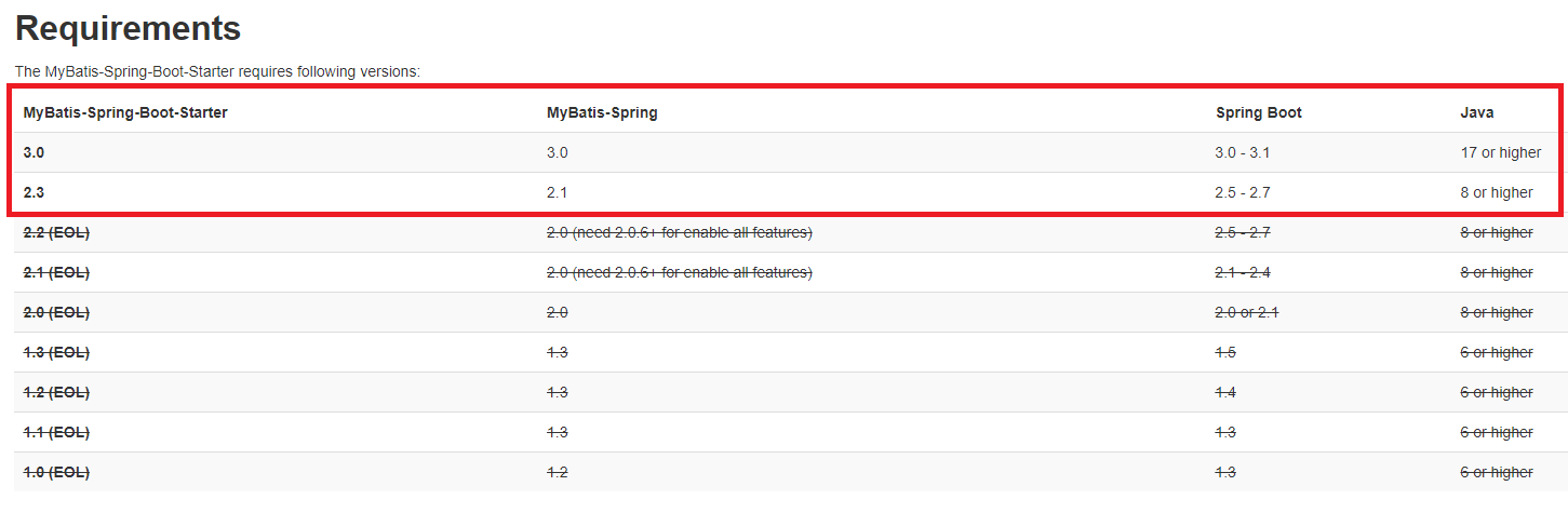 기본적으로 생성되는 스프링부트 프로젝트는 Mybatis를 포함하지 않는다. 따라서 스프링부트에서 Mybatis를 설정할 수 있는 라이브러리를 설치해야 한다. 아래의 mybatis-spring-boot-autoconfigure 요구사항 표를 보면 Spring Boot, Java 버전에 따라 버전이 명시되어 있다.