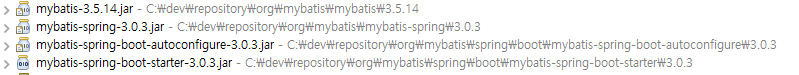 라이브러리를 추가하면, 아래처럼 Mybatis 관련 jar파일들이 추가되는 것을 확인하자. 이렇게 스프링부트는 starter 패키지 라이브러리를 추가해서 mybatis 관련 설정들을 간편하게 가져올 수 있다.