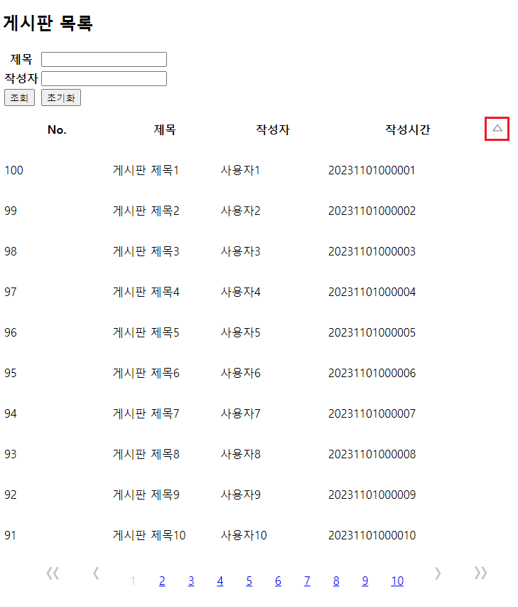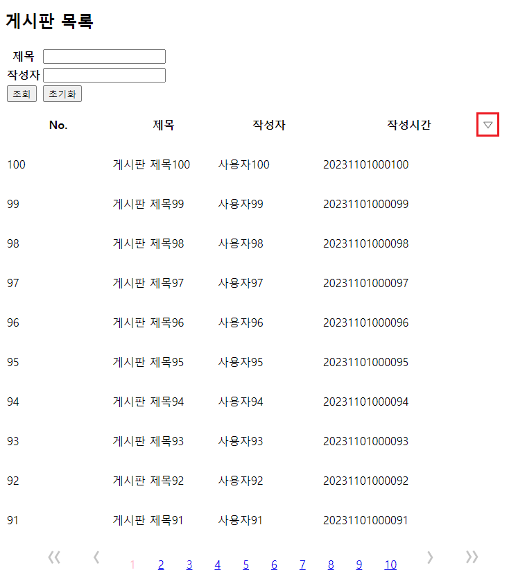 화살표를 클릭할 때마다 sort 요소에 동적 정렬값이 세팅되서 조회되기 때문에, 아래와 같이 내림차순, 오름차순 정렬을 확인할 수 있다.