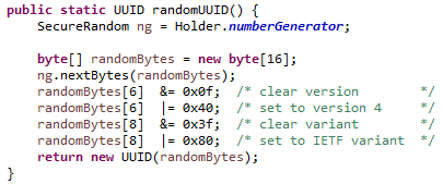 uuid.randomUUID() 기능과 비슷하게 사용할 수 있는 SecureRandom 클래스가 있다. 사실 클래스 내용을 파보면 uuid.randomUUID()는 SecureRandom를 사용하여 구현되어 있음을 알 수 있다.