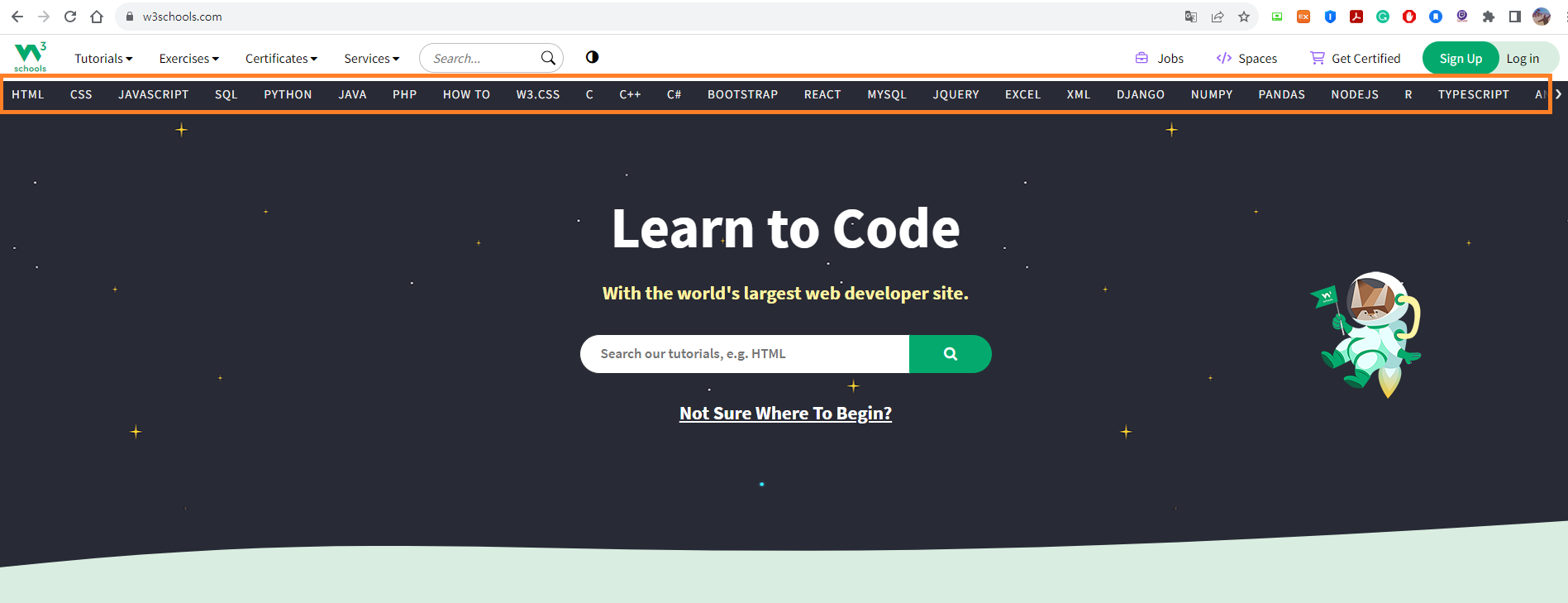 w3schools 사이트에서 상단 메뉴에 나열된 프로그래밍 언어 목록을 파싱 하여 가져오려고 한다.