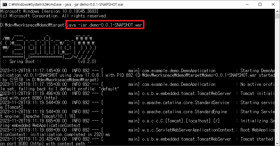 spring boot로 제작된 프로젝트를 실행하려면, 프로젝트를 war 또는 jar 파일로 export 하여 아래처럼 해당 파일을 실행하면 된다.