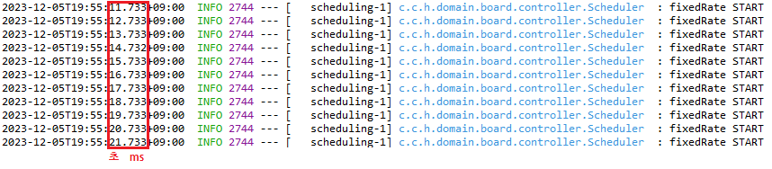 - fixedRate : 메소드의 실행이 시작하는 시간을 기준으로, 설정된 밀리세컨드 간격마다 실행