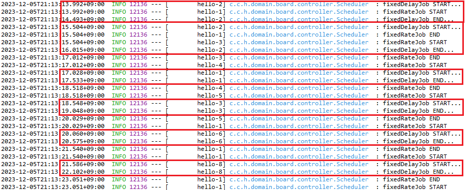 실행 결과를 보면, 이전에 scheduling-1 로만 표시되던 스레드가 hello-n으로 바뀐 것을 확인할 수 있다. 설정한 대로 10의 size를 가지는 thread pool에서 작업들이 수행되게 된 것이다. 그 결과 fixedDelayJob은 정상적으로 1.5초마다 실행된다. (참고 : How to Schedule Tasks with Spring Boot)