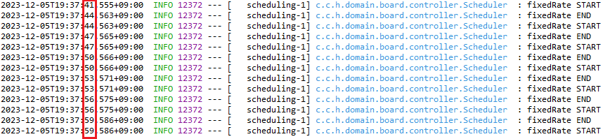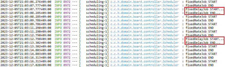 sleep으로 3초씩 강제로 지연시킴으로써 작업 수행시간이 fixedRate를 넘겨버렸으므로 작업이 끝나자마자 다음 n초대를 기다리지 않고, 바로 다음 작업을 실행한다. 즉, fixedRate은 작업의 수행시간이 길어진다면, 주기적인 실행을 보장하지 못하는 점을 주의해야 한다.