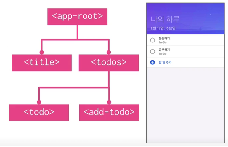 앵귤러 애플리케이션은 여러 컴포넌트로 구성되어 있으며, 애플리케이션에서 가장 중요한 구성 요소이다. 여러 html 요소들이 한 컴포넌트에 그룹화되어 있다.