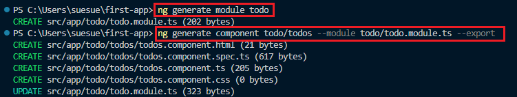 이어서 todo 모듈 내부에 todos 컴포넌트를 생성한다. 이때 --module 플래그로 특정 모듈을 직접 지정가능한데 todo.module.ts 파일을 직접 지정했다. 또한 todo 컴포넌트는 다른 데서 사용할 수 있다는 의미로 --export 플래그를 추가한다. ( todo 컴포넌트도 export를 하기 때문에 ES6 모듈이 된다)