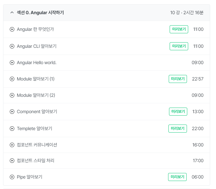 아쉬운 점은 2017년도에 올라온 강의라서 앵귤러 버전부터 소스까지 미세하게 달라진 부분이 많았지만, 컴포넌트 및 모듈 개념이나 ES6 문법은 대체로 비슷해서 큰 문제없이 수강할 수 있었다. 가볍게 앵귤러에 대해 파악하고 싶다면 들어볼 만한 강의이다.