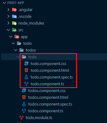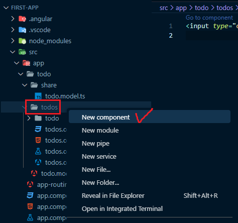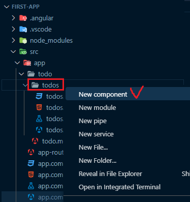 이전 포스팅에서 반복문으로 표현했던 Todo 목록을 별도의 컴포넌트로 분리할 것이다. todos 폴더 우클릭 후 [New Component]를 선택하여 입력창에 todo를 입력한다. 그러면 오른쪽 사진과 같이 todos/todo 컴포넌트가 생성된다.