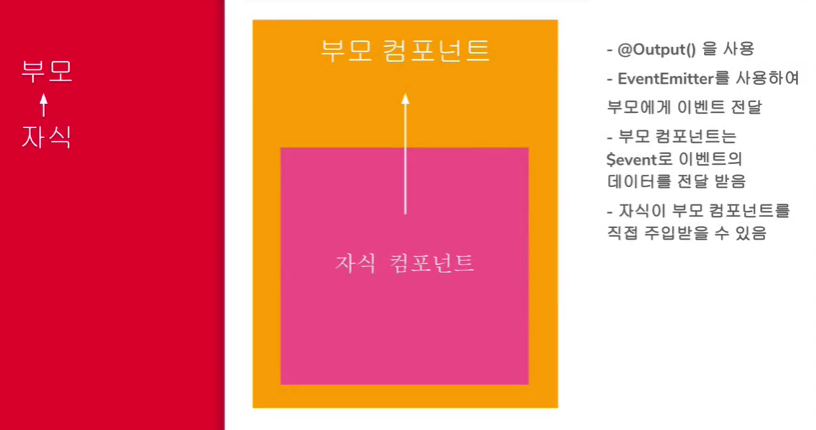 ✅ 자식 컴포넌트에서 부모 컴포넌트로 이벤트를 발송할 때는 @Output 데코레이터와 EventEmitter를 이용하여 특정 이벤트와 데이터를 발생시킬 수 있다.