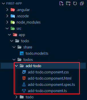 이제 @Input과 반대의 케이스인 @Output 케이스를 보기 위해 별도의 컴포넌트로 분리할 것이다. todos 폴더 우클릭 후 [New Component]를 선택하여 입력창에 add-todo를 입력한다. 그러면 오른쪽 사진과 같이 todos/add-todo 컴포넌트가 생성된다.