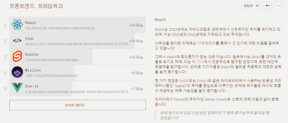 risingstars 사이트에 접속하면 2023년 프론트엔드 프레임워크 인기 순위를 알 수 있다. React가 2021년부터 현재까지 자바스크립트 생태계에서 1위를 유지하고 있다. 대표적인 프론트엔드 3대장 (React, Vue, Angular) 말고도 htmx, Svelte, Million 등 프레임워크가 인기를 끌고 있다. 그래프 오른쪽에는 사람들이 덧붙인 코멘트가 있어서 같이 읽어보면 좋다.