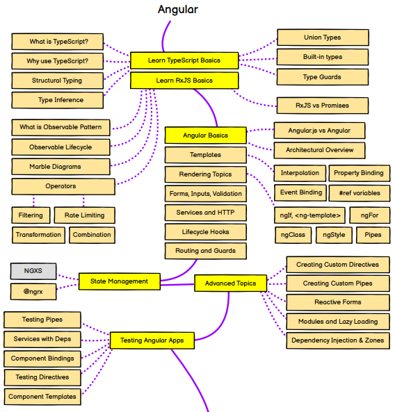 현재 내가 관심있는 앵귤러 프레임워크를 예시로 살펴보자면 TypeScript부터 RxJS, Angular CLI 등 필요한 개념들을 짚어주고 있다. 원하는 언어나 스킬이 있다면 참고해볼 만한 사이트이다.