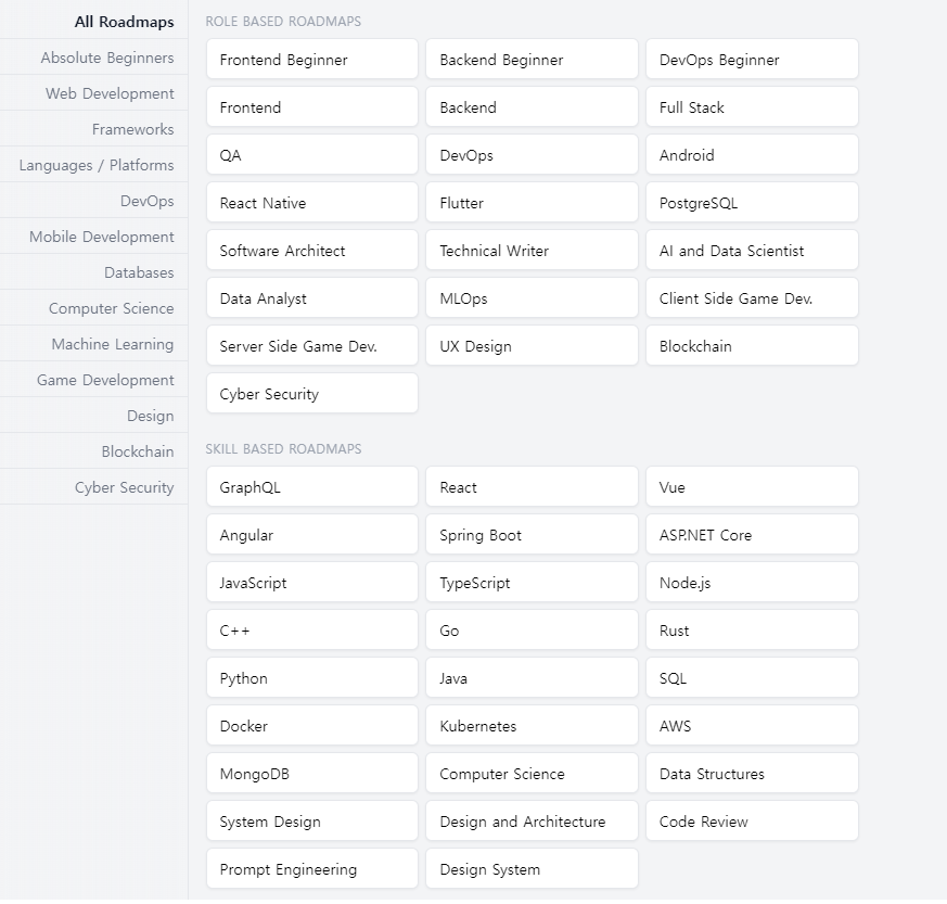 구글링하다가 개발자 로드맵 관련해서 좋은 사이트를 찾아내서 공유한다. Developer Roadmaps 사이트에는 Frontend, Backend 외에도 DevOps, Flutter, React, AI 등 다양한 로드맵을 제시하고 있다.