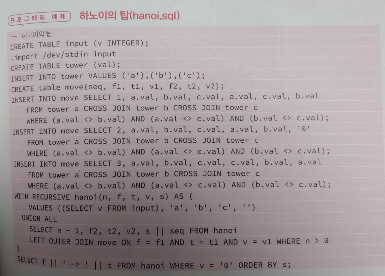 책을 보면서 재미있었던 부분은 '하노이의 탑' 예제를 67개의 언어로 구현했다는 점이다. 아래는 무려 SQL문(!?)으로 하노이의 탑을 구현한 모습이다.