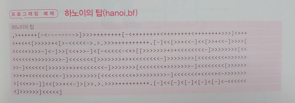 특히 Brainfuck이라는 언어로 구현한 하노이의 탑 예제가 굉장히 인상 깊었다. Brainfuck은 +, -같은 8개의 명령 만으로 소스코드를 짤 수 있다고 한다.