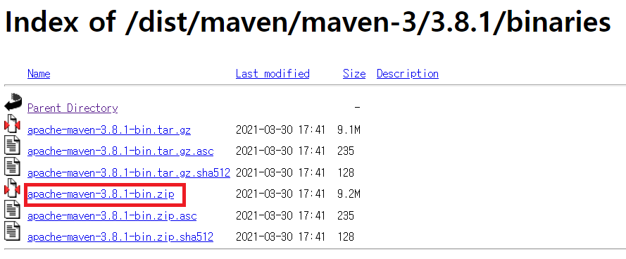 Maven 홈페이지에 접속한 후 Files 란의 최신 버전을 바로 다운받아도 되고, 이전 버전을 사용하려면 maven archive에서 원하는 버전을 다운받을 수 있다. 2022년 1월 기준으로 3.8.4 버전까지 나왔지만 (최신 버전을 받으면 진행하다 막힐 가능성이 높아서) 나는 3.8.1 버전을 다운받으려고 한다.