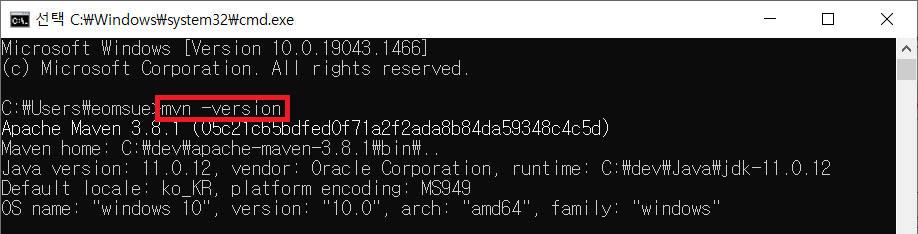 이제 Path 변수에 제대로 등록되었는지 확인하자. '윈도우키+R'을 눌러서 나타난 실행창에 'cmd'를 입력해서 콘솔 창을 띄운다. 콘솔 창에 'mvn -version'라고 입력해서 아래와 같은 화면이 나타나면 설정이 잘 끝난 것이다. 만약 'mvn'은(는) 내부 또는 외부 명령, 실행할 수 있는 프로그램, 또는 배치 파일이 아닙니다. 라는 문구가 뜬다면 Path 설정이 잘못된 것이다.