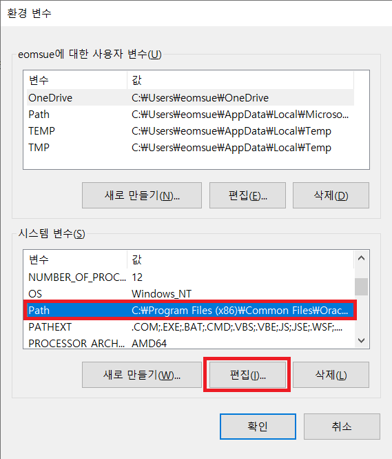 아래와 같이 'Path'를 선택한 후 '편집' 버튼을 클릭한다. Path 변수는 운영체제가 파일의 디렉터리를 파악하는 데 사용하는 경로이다. Path 변수에 디렉터리를 등록하면, 해당 디렉터리에 포함된 파일을 파일 경로 없이 파일 이름만으로도 사용할 수 있게 된다.