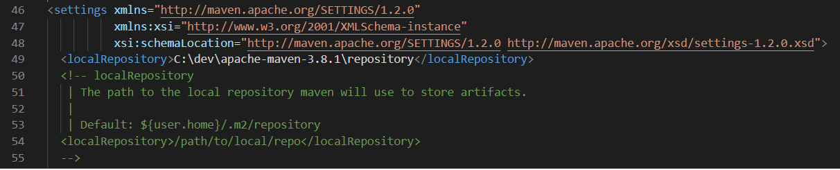 <localRepository>C:\dev\apache-maven-3.8.1\repository</localRepository>