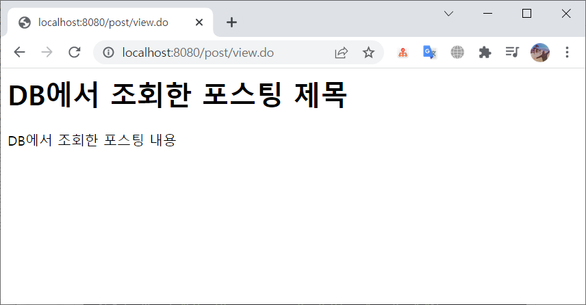 여기까지 진행이 되었다면, 사용자가 http://localhost:8080/post/view.do 로 조회 요청을 하였을 때, DB에서 가져온 결과값이 출력이 될 것이다.