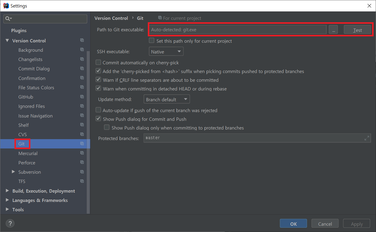 IntelliJ에서 [File]- [Setting] - [Version Control] - [Git]을 들어가서 Git Test를 하려고 한다.
