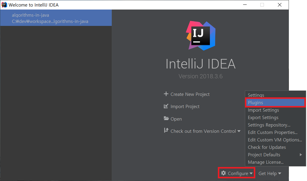 먼저 ignore 플러그인을 설치하자. IntelliJ에서는 Eclipse의 마켓 플레이스와 같이 플러그인을 추가할 수 있게끔 되어있다. IntelliJ에서 [File] - [Close Project] 하면 아래의 창이 뜨는데, 여기서 [Configure] - [Plugins]을 클릭한다.
