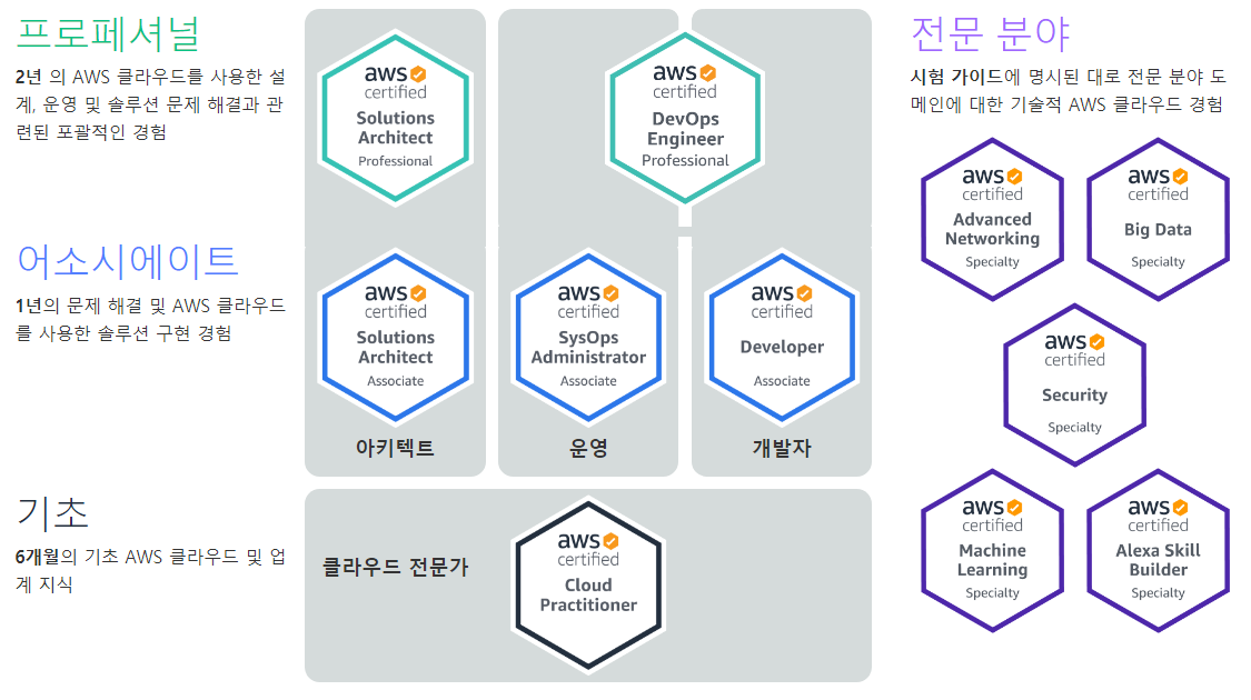 AWS 자격증(Certification)은 3년 동안 유효하다. AWS 자격증 취득 상태를 유지하려면 자격증 갱신을 해야 한다. 기초, 어소시에이트, 프로페셔널, 전문 분야 레벨이 있다.