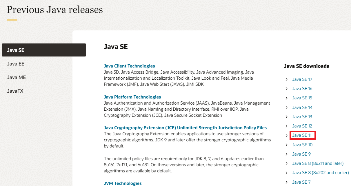 이전 버전을 사용하려면 Java Archive에서 스크롤을 내려 원하는 버전을 다운로드하면 된다. 나는 JDK 11을 다운받으려고 한다.