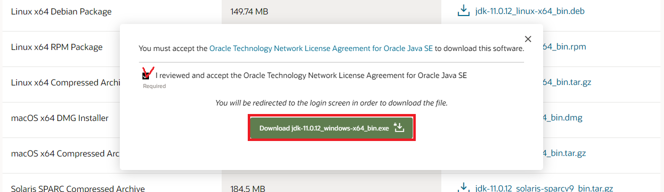 그러면 오라클 로그인 페이지로 이동한다. 로그인을 해야지만 JDK를 다운받을 수 있으므로, 아이디가 없다면 회원 가입을 해야 한다. 다운로드 받은 exe 파일을 실행하면 JDK 설치가 시작된다.