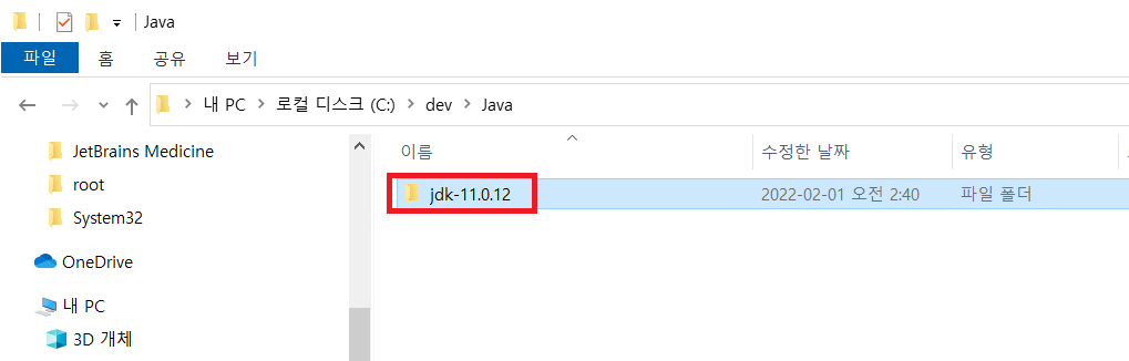 이제 C:\dev\Java 위치로 들어가면 아래와 같이 JDK가 설치된 것을 확인할 수 있다.