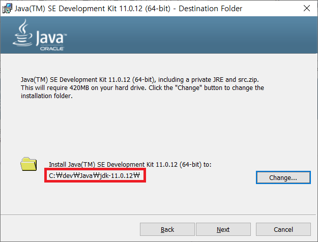 아래 사진은 JDK가 설치될 위치를 지정하는 화면이다. 기본 설치경로는 C:\Program Files\Java\jdk-11.0.12\ 이지만, 나는 C:\dev 폴더에 모을 것이기 때문에 'Change…' 버튼을 눌러서 위치를 변경하였다. 설치경로를 확인하고 'Next' 버튼을 누르면 JDK의 설치가 시작된다.