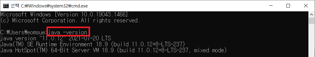 다음은 콘솔 창에 'java -version'라고 입력해서 아래와 같은 화면이 나타나면 설정이 잘 끝난 것이다. 만약 'java'은(는) 내부 또는 외부 명령, 실행할 수 있는 프로그램, 또는 배치 파일이 아닙니다.라는 내용이 나타나면 Path 설정이 잘못된 것이다.