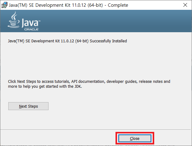 다음과 같은 화면이 나오면 JDK의 설치가 성공적으로 끝난 것이다. 'Close' 버튼을 누른다.