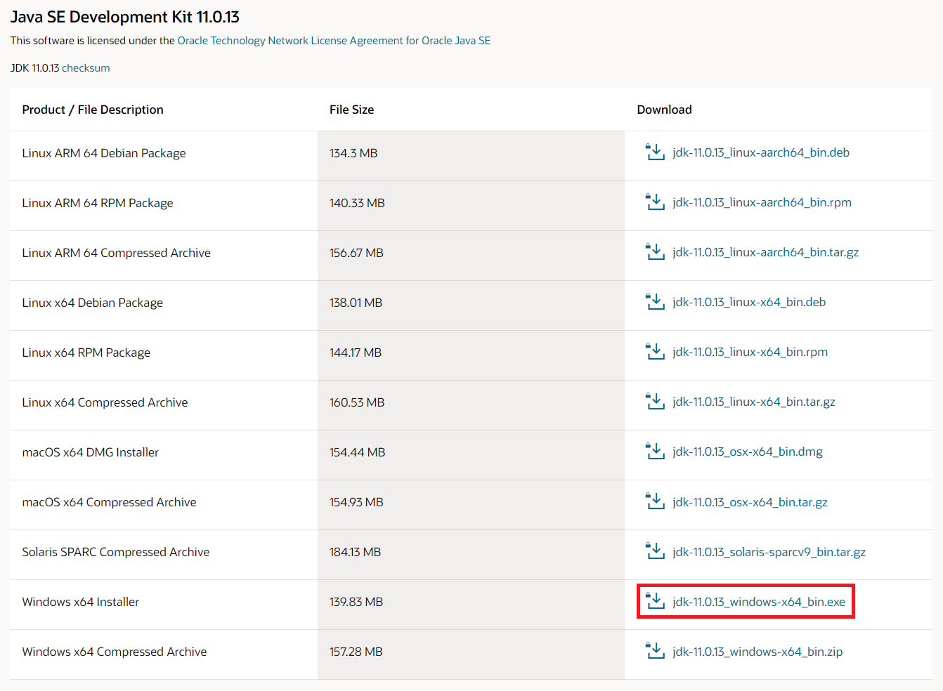 스크롤을 내리다보면 Java SE Development Kit 11.0.13 란이 보인다. 내 PC 운영체제에 맞는 JDK를 선택한다. 만약 설치버전이 x86, x64로 나뉘어져 있다면 아래 포스팅을 참고하자. 일반적인 경우 64 bit인 Window x64인 경우가 많다.