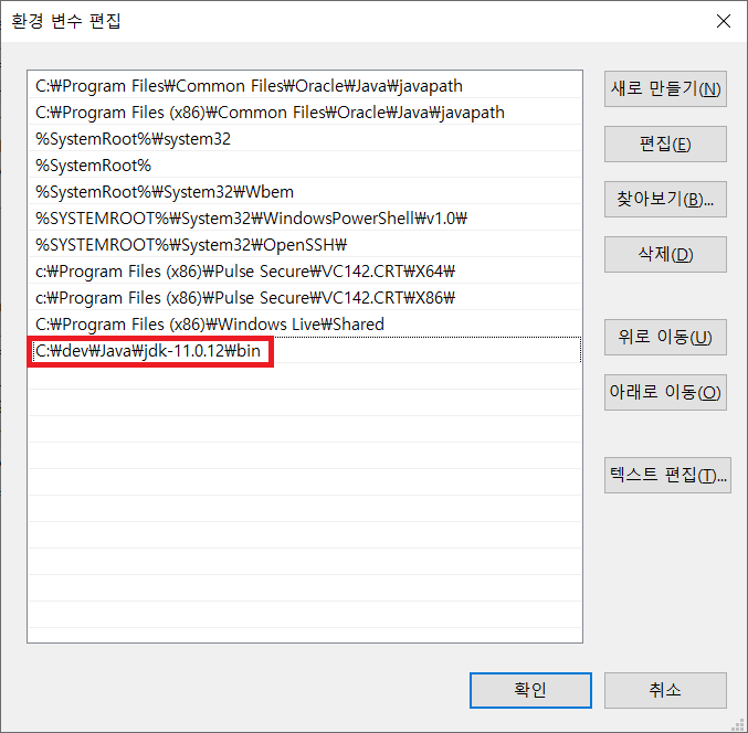 JDK가 설치된 경로를 Path에 추가하기 위해 '새로 만들기'를 클릭하여 C:\dev\Java\jdk-11.0.12\bin 를 입력하고 'Enter' 키를 누른다. bin 디렉터리에는 자바로 프로그램을 개발하는데 필요한 실행파일들이 들어있다. Path 변수에 주소가 추가된 것을 확인하고 '확인' 버튼을 눌러 창을 닫는다.