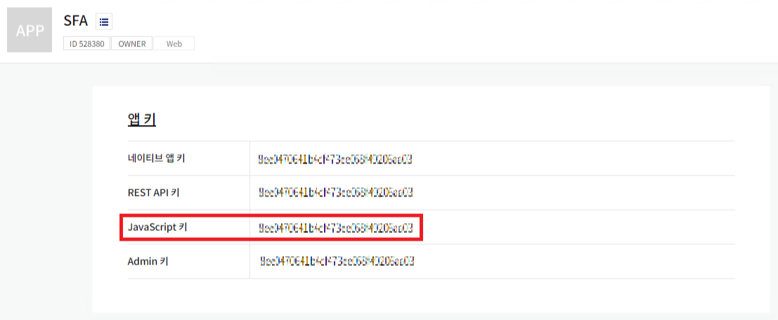 그러면 아래와 같이 플랫폼별 앱 키가 발급되는데 JavaScript로 카카오 공유 기능을 구현할 것이기 때문에 이 중에서 JavaScript 앱 키만 기억해두면 된다. (참고 : 카카오, 네이버 OpenAPI 앱 키 발급받는 방법)