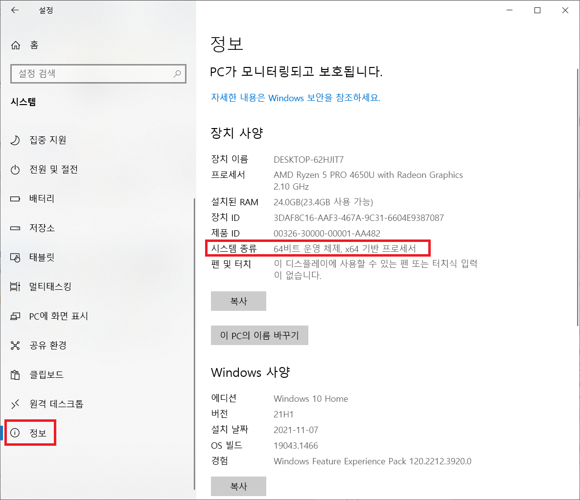 시스템에서 스크롤을 내려 '정보'를 클릭하면 우측 화면에 시스템 종류를 확인할 수 있다. 내 경우 x64 기반으로 명시되어 있고 거의 대부분의 경우가 x64 비트일 것이다.
